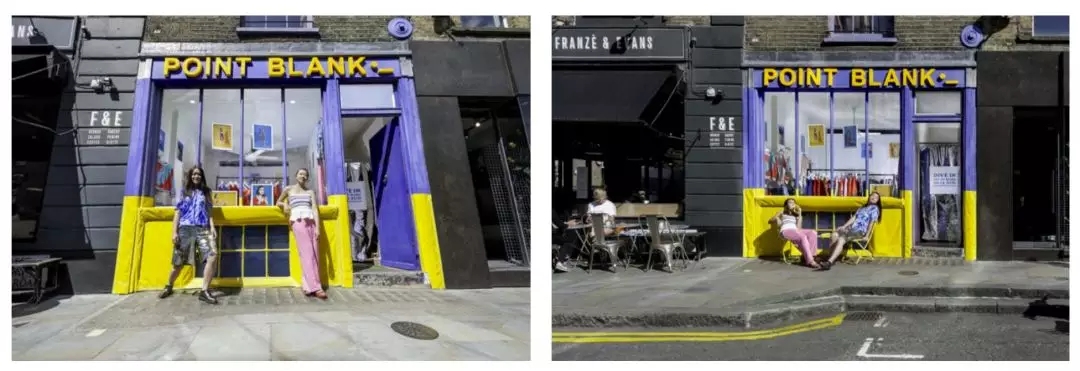 还有一种常见的方法是制造反差,例如这个 POINTBLANK 的夏装快闪店就采用了视觉反差的手法。它的主题是加州泳池,开在伦敦的时尚地标红教堂街,