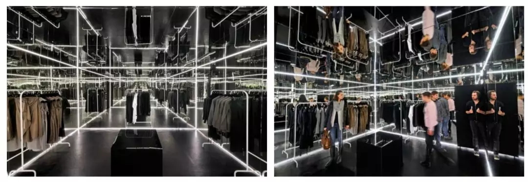 除了上边两种造价昂贵,耗费精力的手法,也有一些成本不高,简单直接的方案,比较有代表性的就是对镜面、灯管的运用,让人在进入空间后有真假难